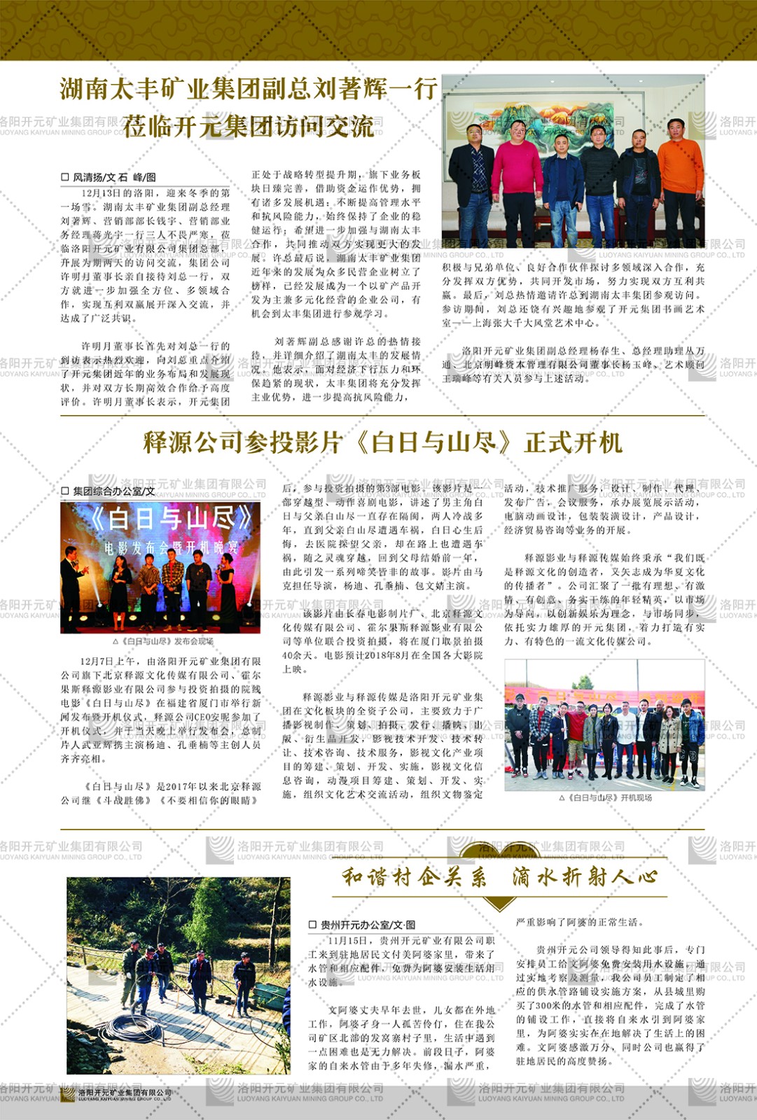 洛陽開元礦業(yè)集團有限公司簡介洛陽開元礦業(yè)集團有限公司,始成立于2006年,位于洛陽市開元大道269號。集團旗下共有十余家全資子公司,業(yè)務涉及有色金屬礦山開發(fā)、礦產(chǎn)品購銷與進出口貿(mào)易、房地產(chǎn)開發(fā)、文化藝術、企業(yè)管理與咨詢、資本投資等多個領域。2024年,集團公司銷售總額達7.8億元。民建河南省委委員、民建河南省委企業(yè)委副主任、民建洛陽市委委員、企業(yè)委主任、洛陽民建企業(yè)家協(xié)會會長許明月是公司創(chuàng)始人,現(xiàn)任洛陽開元礦業(yè)集團有限公司董事長。在礦業(yè)領域,洛陽開元礦業(yè)集團擁有多家實力雄厚的子公司:貴州開元礦業(yè)有限公司探、采礦權面積共11.33平方公里;興海縣銅鑫礦業(yè)有限公司探礦權面積8.76平方公里,礦山資源潛力巨大;2021年,開元集團與盧氏中科礦業(yè)有限公司開展戰(zhàn)略合作。盧氏中科礦業(yè)有限公司專注于有色金屬的浮選、加工和銷售,擁有強大的技術支撐平臺,是集探、采、選、冶、研為一體的中大型綜合礦業(yè)企業(yè)。目前,盧氏中科王家河1000噸選礦廠已成功投產(chǎn),雙河金礦、柳關欒盧鉛鋅礦相繼順利開工,樓房銀礦與圪老灣鉛鋅礦的深部探礦重大突破,標志著礦山版圖取得重大進展,為開元集團后續(xù)發(fā)展奠定了堅實基礎。在文化傳媒領域,洛陽市明月美術館通過豐富多樣的藝術展覽、學術研討和公共教育活動,努力打造一個集展覽、交流、教育、研究為一體的綜合性藝術平臺。此外,在金融投資領域,開元集團旗下的北京明峰資本管理有限公司專注于投資具有高增長潛力的優(yōu)秀企業(yè),特別是高科技、新能源、環(huán)保等新興產(chǎn)業(yè),為客戶提供個性化的資產(chǎn)配置服務。在做好企業(yè)經(jīng)營的同時,開元集團始終不忘企業(yè)的社會責任和家國情懷,以突出的愛心公益事跡,開展了一系列公益慈善活動:“民建林”公益事業(yè)通過“思源基金”“幫幫公益”線上公益平臺,與眾多愛心人士籌措資金20余萬元;資助541名貧困大學生共計270余萬元,推進“數(shù)字助力——河南AI人才培養(yǎng)”;捐款10萬元,馳援京津冀、黑龍江洪水地質(zhì)災害……公司于2017年底被洛陽市慈善總會評為“洛陽慈善風云榜——十大愛心集體”。洛陽開元礦業(yè)集團有限公司秉承持續(xù)發(fā)展理念,憑借多年來良好的企業(yè)信譽與經(jīng)營業(yè)績,與全國多家企業(yè)建立了良好合作關系,受到社會各界的一致好評,多次榮獲“納稅標兵”“先進企業(yè)”“招商引資模范企業(yè)”等榮譽稱號?;赝麃頃r路,開元人勠力同心,以“闖”的精神和“創(chuàng)”的勁頭,一路披荊斬棘,踏過千山萬水;展望新未來,開元人凝心聚力,不執(zhí)于“舊”,無畏于“新”,秉承“勇于跨越,追求卓越”的企業(yè)精神,乘著國家高質(zhì)量發(fā)展新征程的東風,跨過高山,越過大海,向著集團多元化、國際化的目標,逐夢遠航,跨越前行!