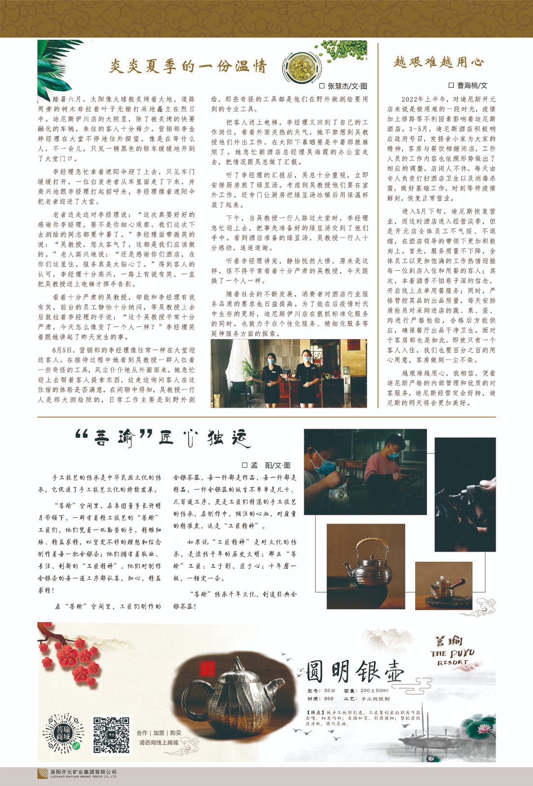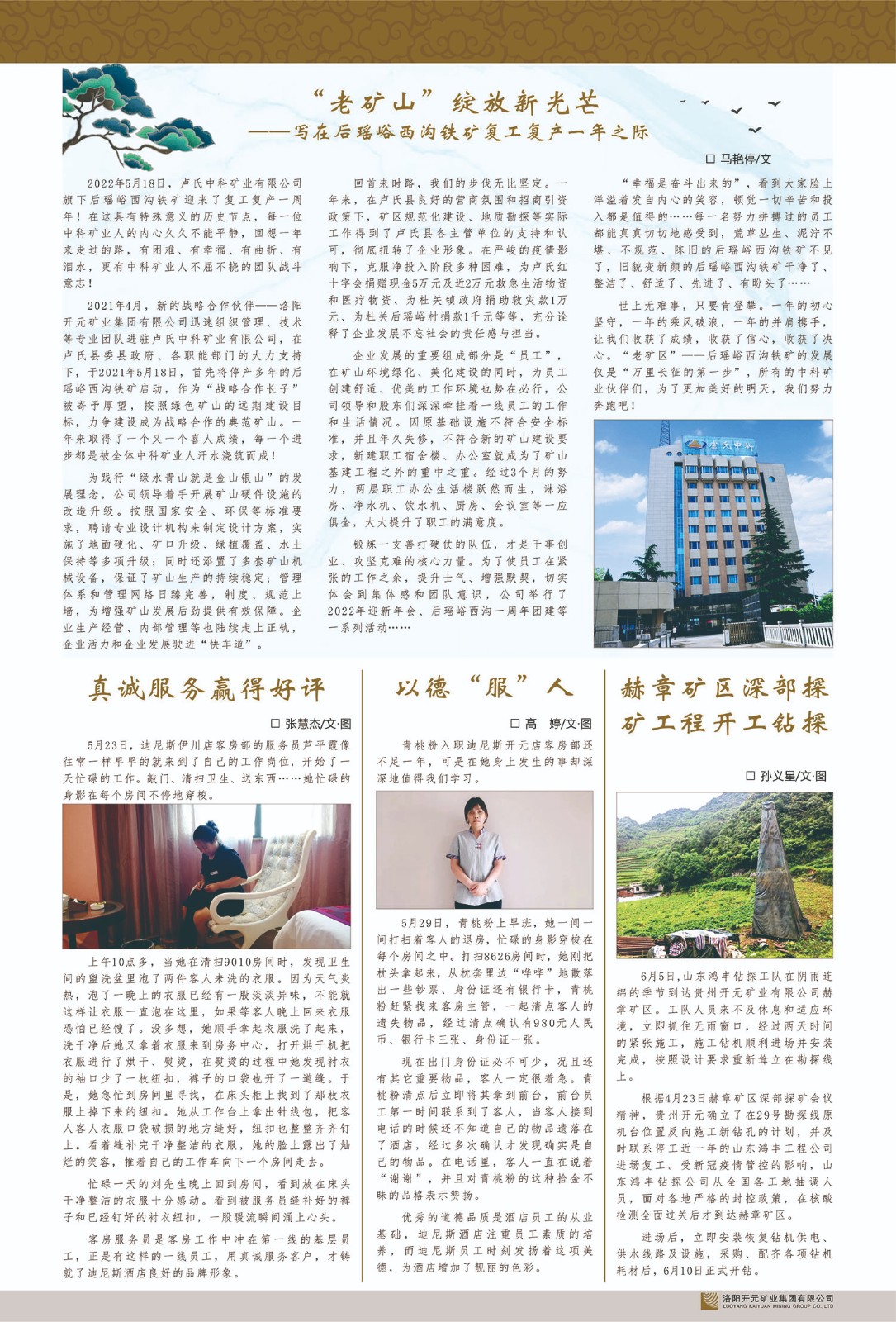洛陽(yáng)開(kāi)元礦業(yè)集團(tuán)有限公司簡(jiǎn)介洛陽(yáng)開(kāi)元礦業(yè)集團(tuán)有限公司,始成立于2006年,位于洛陽(yáng)市開(kāi)元大道269號(hào)。集團(tuán)旗下共有十余家全資子公司,業(yè)務(wù)涉及有色金屬礦山開(kāi)發(fā)、礦產(chǎn)品購(gòu)銷與進(jìn)出口貿(mào)易、房地產(chǎn)開(kāi)發(fā)、文化藝術(shù)、企業(yè)管理與咨詢、資本投資等多個(gè)領(lǐng)域。2024年,集團(tuán)公司銷售總額達(dá)7.8億元。民建河南省委委員、民建河南省委企業(yè)委副主任、民建洛陽(yáng)市委委員、企業(yè)委主任、洛陽(yáng)民建企業(yè)家協(xié)會(huì)會(huì)長(zhǎng)許明月是公司創(chuàng)始人,現(xiàn)任洛陽(yáng)開(kāi)元礦業(yè)集團(tuán)有限公司董事長(zhǎng)。在礦業(yè)領(lǐng)域,洛陽(yáng)開(kāi)元礦業(yè)集團(tuán)擁有多家實(shí)力雄厚的子公司:貴州開(kāi)元礦業(yè)有限公司探、采礦權(quán)面積共11.33平方公里;興??h銅鑫礦業(yè)有限公司探礦權(quán)面積8.76平方公里,礦山資源潛力巨大;2021年,開(kāi)元集團(tuán)與盧氏中科礦業(yè)有限公司開(kāi)展戰(zhàn)略合作。盧氏中科礦業(yè)有限公司專注于有色金屬的浮選、加工和銷售,擁有強(qiáng)大的技術(shù)支撐平臺(tái),是集探、采、選、冶、研為一體的中大型綜合礦業(yè)企業(yè)。目前,盧氏中科王家河1000噸選礦廠已成功投產(chǎn),雙河金礦、柳關(guān)欒盧鉛鋅礦相繼順利開(kāi)工,樓房銀礦與圪老灣鉛鋅礦的深部探礦重大突破,標(biāo)志著礦山版圖取得重大進(jìn)展,為開(kāi)元集團(tuán)后續(xù)發(fā)展奠定了堅(jiān)實(shí)基礎(chǔ)。在文化傳媒領(lǐng)域,洛陽(yáng)市明月美術(shù)館通過(guò)豐富多樣的藝術(shù)展覽、學(xué)術(shù)研討和公共教育活動(dòng),努力打造一個(gè)集展覽、交流、教育、研究為一體的綜合性藝術(shù)平臺(tái)。此外,在金融投資領(lǐng)域,開(kāi)元集團(tuán)旗下的北京明峰資本管理有限公司專注于投資具有高增長(zhǎng)潛力的優(yōu)秀企業(yè),特別是高科技、新能源、環(huán)保等新興產(chǎn)業(yè),為客戶提供個(gè)性化的資產(chǎn)配置服務(wù)。在做好企業(yè)經(jīng)營(yíng)的同時(shí),開(kāi)元集團(tuán)始終不忘企業(yè)的社會(huì)責(zé)任和家國(guó)情懷,以突出的愛(ài)心公益事跡,開(kāi)展了一系列公益慈善活動(dòng):“民建林”公益事業(yè)通過(guò)“思源基金”“幫幫公益”線上公益平臺(tái),與眾多愛(ài)心人士籌措資金20余萬(wàn)元;資助541名貧困大學(xué)生共計(jì)270余萬(wàn)元,推進(jìn)“數(shù)字助力——河南AI人才培養(yǎng)”;捐款10萬(wàn)元,馳援京津冀、黑龍江洪水地質(zhì)災(zāi)害……公司于2017年底被洛陽(yáng)市慈善總會(huì)評(píng)為“洛陽(yáng)慈善風(fēng)云榜——十大愛(ài)心集體”。洛陽(yáng)開(kāi)元礦業(yè)集團(tuán)有限公司秉承持續(xù)發(fā)展理念,憑借多年來(lái)良好的企業(yè)信譽(yù)與經(jīng)營(yíng)業(yè)績(jī),與全國(guó)多家企業(yè)建立了良好合作關(guān)系,受到社會(huì)各界的一致好評(píng),多次榮獲“納稅標(biāo)兵”“先進(jìn)企業(yè)”“招商引資模范企業(yè)”等榮譽(yù)稱號(hào)。回望來(lái)時(shí)路,開(kāi)元人勠力同心,以“闖”的精神和“創(chuàng)”的勁頭,一路披荊斬棘,踏過(guò)千山萬(wàn)水;展望新未來(lái),開(kāi)元人凝心聚力,不執(zhí)于“舊”,無(wú)畏于“新”,秉承“勇于跨越,追求卓越”的企業(yè)精神,乘著國(guó)家高質(zhì)量發(fā)展新征程的東風(fēng),跨過(guò)高山,越過(guò)大海,向著集團(tuán)多元化、國(guó)際化的目標(biāo),逐夢(mèng)遠(yuǎn)航,跨越前行!