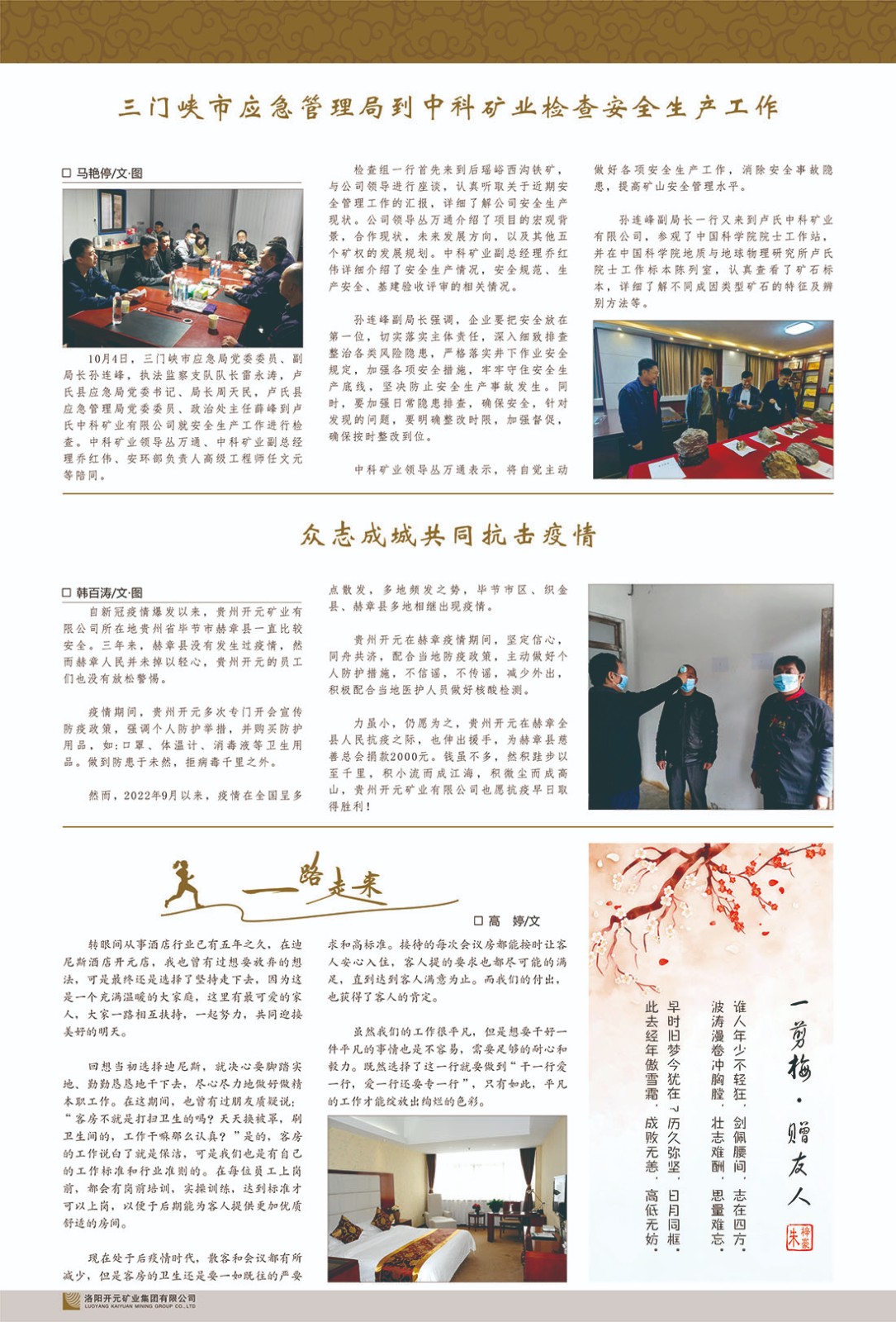 洛陽開元礦業(yè)集團有限公司簡介洛陽開元礦業(yè)集團有限公司,始成立于2006年,位于洛陽市開元大道269號。集團旗下共有十余家全資子公司,業(yè)務(wù)涉及有色金屬礦山開發(fā)、礦產(chǎn)品購銷與進出口貿(mào)易、房地產(chǎn)開發(fā)、文化藝術(shù)、企業(yè)管理與咨詢、資本投資等多個領(lǐng)域。2024年,集團公司銷售總額達7.8億元。民建河南省委委員、民建河南省委企業(yè)委副主任、民建洛陽市委委員、企業(yè)委主任、洛陽民建企業(yè)家協(xié)會會長許明月是公司創(chuàng)始人,現(xiàn)任洛陽開元礦業(yè)集團有限公司董事長。在礦業(yè)領(lǐng)域,洛陽開元礦業(yè)集團擁有多家實力雄厚的子公司:貴州開元礦業(yè)有限公司探、采礦權(quán)面積共11.33平方公里;興??h銅鑫礦業(yè)有限公司探礦權(quán)面積8.76平方公里,礦山資源潛力巨大;2021年,開元集團與盧氏中科礦業(yè)有限公司開展戰(zhàn)略合作。盧氏中科礦業(yè)有限公司專注于有色金屬的浮選、加工和銷售,擁有強大的技術(shù)支撐平臺,是集探、采、選、冶、研為一體的中大型綜合礦業(yè)企業(yè)。目前,盧氏中科王家河1000噸選礦廠已成功投產(chǎn),雙河金礦、柳關(guān)欒盧鉛鋅礦相繼順利開工,樓房銀礦與圪老灣鉛鋅礦的深部探礦重大突破,標(biāo)志著礦山版圖取得重大進展,為開元集團后續(xù)發(fā)展奠定了堅實基礎(chǔ)。在文化傳媒領(lǐng)域,洛陽市明月美術(shù)館通過豐富多樣的藝術(shù)展覽、學(xué)術(shù)研討和公共教育活動,努力打造一個集展覽、交流、教育、研究為一體的綜合性藝術(shù)平臺。此外,在金融投資領(lǐng)域,開元集團旗下的北京明峰資本管理有限公司專注于投資具有高增長潛力的優(yōu)秀企業(yè),特別是高科技、新能源、環(huán)保等新興產(chǎn)業(yè),為客戶提供個性化的資產(chǎn)配置服務(wù)。在做好企業(yè)經(jīng)營的同時,開元集團始終不忘企業(yè)的社會責(zé)任和家國情懷,以突出的愛心公益事跡,開展了一系列公益慈善活動:“民建林”公益事業(yè)通過“思源基金”“幫幫公益”線上公益平臺,與眾多愛心人士籌措資金20余萬元;資助541名貧困大學(xué)生共計270余萬元,推進“數(shù)字助力——河南AI人才培養(yǎng)”;捐款10萬元,馳援京津冀、黑龍江洪水地質(zhì)災(zāi)害……公司于2017年底被洛陽市慈善總會評為“洛陽慈善風(fēng)云榜——十大愛心集體”。洛陽開元礦業(yè)集團有限公司秉承持續(xù)發(fā)展理念,憑借多年來良好的企業(yè)信譽與經(jīng)營業(yè)績,與全國多家企業(yè)建立了良好合作關(guān)系,受到社會各界的一致好評,多次榮獲“納稅標(biāo)兵”“先進企業(yè)”“招商引資模范企業(yè)”等榮譽稱號。回望來時路,開元人勠力同心,以“闖”的精神和“創(chuàng)”的勁頭,一路披荊斬棘,踏過千山萬水;展望新未來,開元人凝心聚力,不執(zhí)于“舊”,無畏于“新”,秉承“勇于跨越,追求卓越”的企業(yè)精神,乘著國家高質(zhì)量發(fā)展新征程的東風(fēng),跨過高山,越過大海,向著集團多元化、國際化的目標(biāo),逐夢遠航,跨越前行!