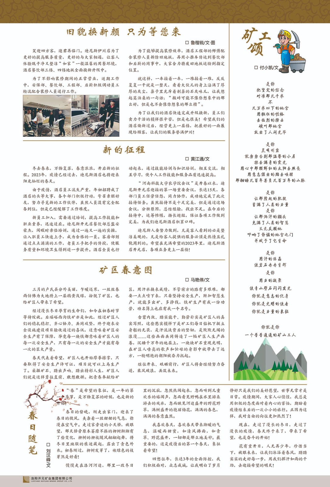 洛陽開元礦業(yè)集團有限公司簡介洛陽開元礦業(yè)集團有限公司,始成立于2006年,位于洛陽市開元大道269號。集團旗下共有十余家全資子公司,業(yè)務涉及有色金屬礦山開發(fā)、礦產(chǎn)品購銷與進出口貿(mào)易、房地產(chǎn)開發(fā)、文化藝術、企業(yè)管理與咨詢、資本投資等多個領域。2024年,集團公司銷售總額達7.8億元。民建河南省委委員、民建河南省委企業(yè)委副主任、民建洛陽市委委員、企業(yè)委主任、洛陽民建企業(yè)家協(xié)會會長許明月是公司創(chuàng)始人,現(xiàn)任洛陽開元礦業(yè)集團有限公司董事長。在礦業(yè)領域,洛陽開元礦業(yè)集團擁有多家實力雄厚的子公司:貴州開元礦業(yè)有限公司探、采礦權面積共11.33平方公里;興海縣銅鑫礦業(yè)有限公司探礦權面積8.76平方公里,礦山資源潛力巨大;2021年,開元集團與盧氏中科礦業(yè)有限公司開展戰(zhàn)略合作。盧氏中科礦業(yè)有限公司專注于有色金屬的浮選、加工和銷售,擁有強大的技術支撐平臺,是集探、采、選、冶、研為一體的中大型綜合礦業(yè)企業(yè)。目前,盧氏中科王家河1000噸選礦廠已成功投產(chǎn),雙河金礦、柳關欒盧鉛鋅礦相繼順利開工,樓房銀礦與圪老灣鉛鋅礦的深部探礦重大突破,標志著礦山版圖取得重大進展,為開元集團后續(xù)發(fā)展奠定了堅實基礎。在文化傳媒領域,洛陽市明月美術館通過豐富多樣的藝術展覽、學術研討和公共教育活動,努力打造一個集展覽、交流、教育、研究為一體的綜合性藝術平臺。此外,在金融投資領域,開元集團旗下的北京明峰資本管理有限公司專注于投資具有高增長潛力的優(yōu)秀企業(yè),特別是高科技、新能源、環(huán)保等新興產(chǎn)業(yè),為客戶提供個性化的資產(chǎn)配置服務。在做好企業(yè)經(jīng)營的同時,開元集團始終不忘企業(yè)的社會責任和家國情懷,以突出的愛心公益事跡,開展了一系列公益慈善活動:“民建林”公益事業(yè)通過“思源基金”“幫幫公益”線上公益平臺,與眾多愛心人士籌措資金20余萬元;資助541名貧困大學生共計270余萬元,推進“數(shù)字助力——河南AI人才培養(yǎng)”;捐款10萬元,馳援京津冀、黑龍江洪水地質災害……公司于2017年底被洛陽市慈善總會評為“洛陽慈善風云榜——十大愛心集體”。洛陽開元礦業(yè)集團有限公司秉承持續(xù)發(fā)展理念,憑借多年來良好的企業(yè)信譽與經(jīng)營業(yè)績,與全國多家企業(yè)建立了良好合作關系,受到社會各界的一致好評,多次榮獲“納稅標兵”“先進企業(yè)”“招商引資模范企業(yè)”等榮譽稱號?;赝麃頃r路,開元人勠力同心,以“闖”的精神和“創(chuàng)”的勁頭,一路披荊斬棘,踏過千山萬水;展望新未來,開元人凝心聚力,不執(zhí)于“舊”,無畏于“新”,秉承“勇于跨越,追求卓越”的企業(yè)精神,乘著國家高質量發(fā)展新征程的東風,跨過高山,越過大海,向著集團多元化、國際化的目標,逐夢遠航,跨越前行!